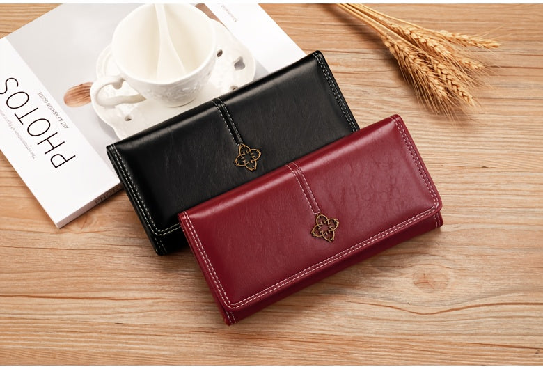 Carteira Longa Feminina com Hardware Dourado – Modelo Double-Fold com Porta-Cartões e Forro em Poliéster (Preta/Vinho)